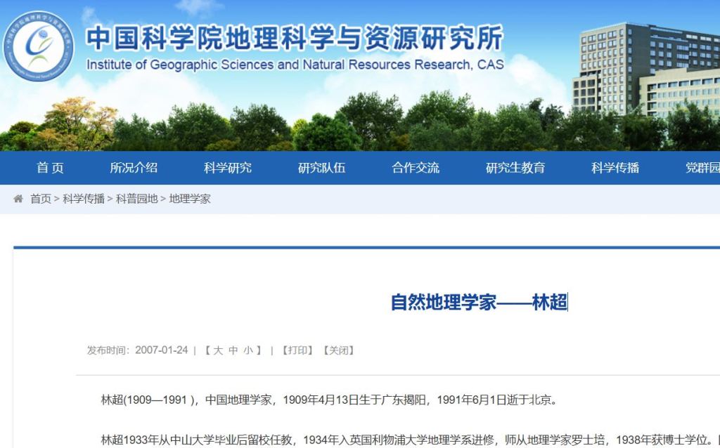 林超(1909—1991 ),中国地理学家,1909年4月13日生于广东揭阳,1991年6月1日逝于北京。